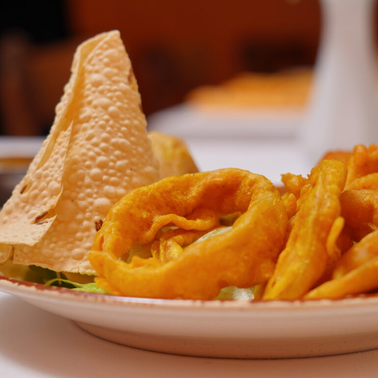 Onion rings dipped in a spiced chick pea batter