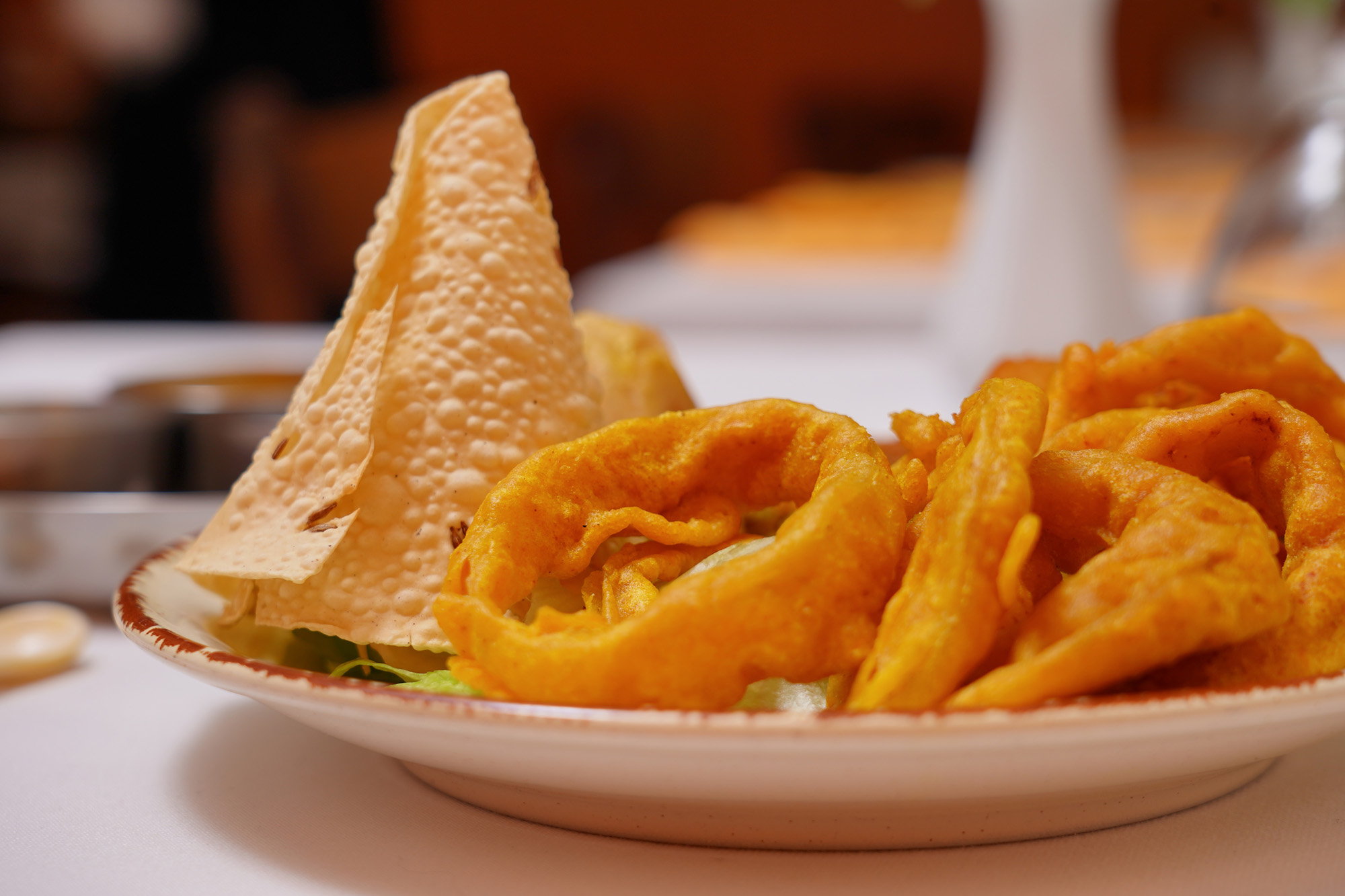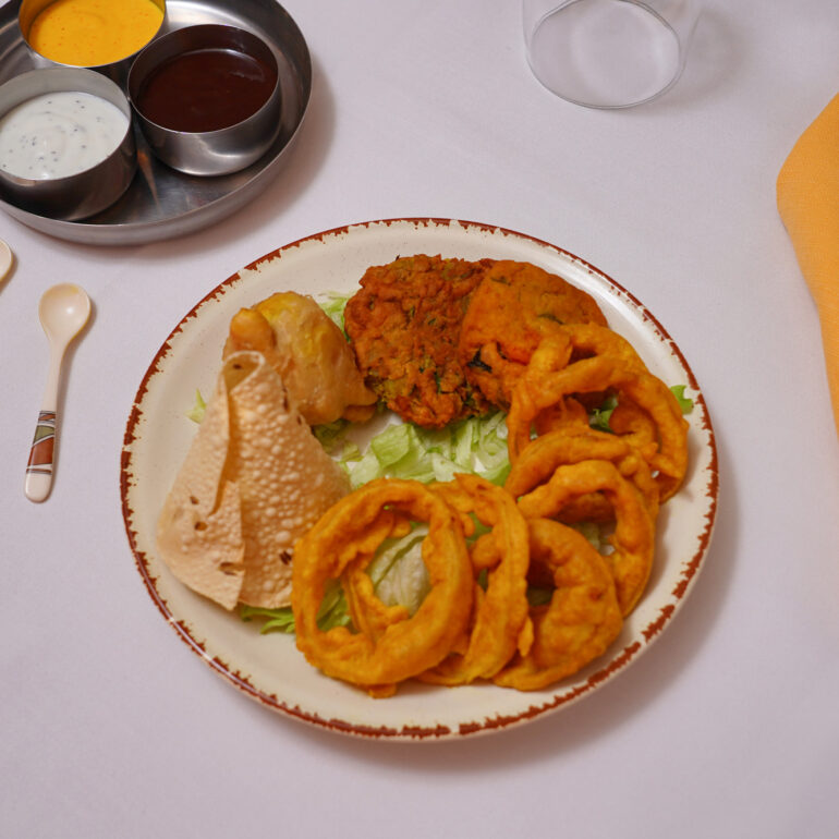 Consists of vegetable and meat samosa, onion rings and papad