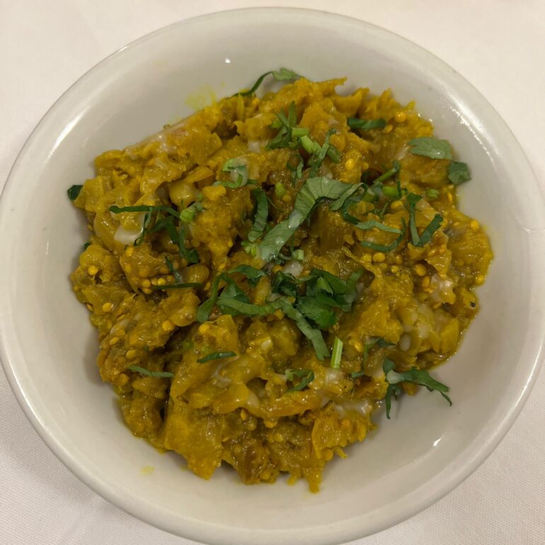 Samashed eggplant roasted with ginger, garlic, onions and tomatoes