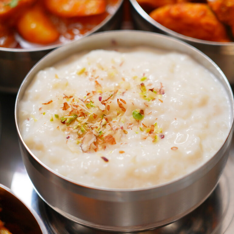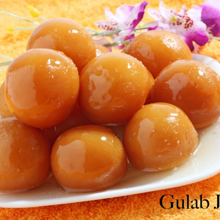 Creamed milk dumplings within a sweet syrup flavored with green cardamoms.