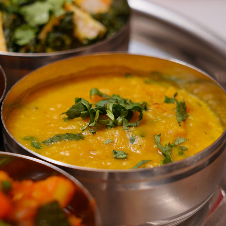 Yellow split lentils cooked with cumin seeds, ginger, garlic, tomatoes and turmeric
