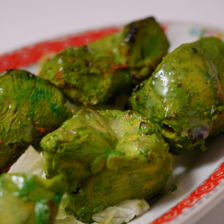 Fillets of chicken marinated in yogurt, spices and mint overnight. skewed and cooked in the tandoor