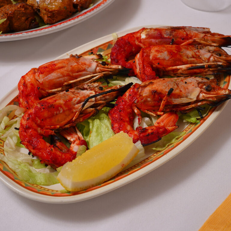Gamberoni marinati nello yogurt e insaporiti con una speciale miscela preparata dallo chef e grigliati nel forno tandoori