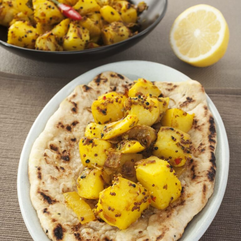 Potatoes and florets of caulifl ower cooked with cumin seeds, turmeric, coriander and spices.