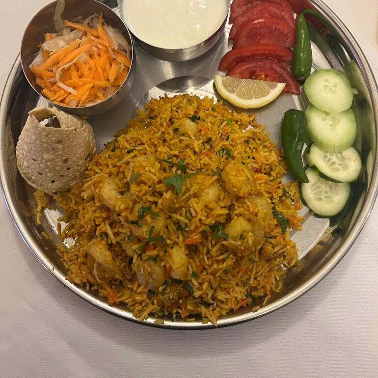 Basmati rice cooked with prawn, ghee and spices.